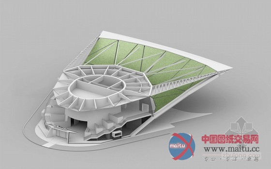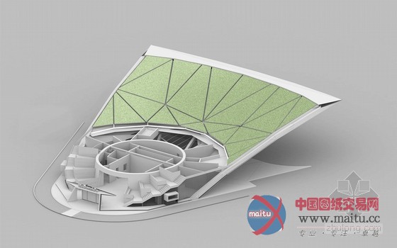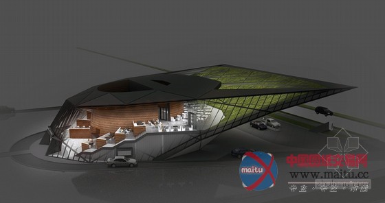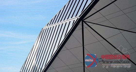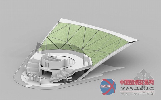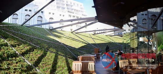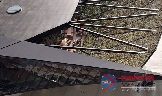 另外几侧被水池包围,形成了统一的城市景观。从另一侧进入建筑后,顺着大楼梯逐渐向上,楼梯的休息平台处也作为用餐区。置顶之后会被眼前的绿色大坡地所震撼,让人意想不到的空中花园来自悬挑部分的建筑屋顶。既然地面的空间留给了城市,那么空中的精彩当然要留给建筑的使用者。