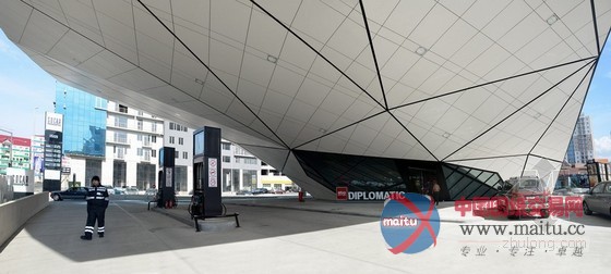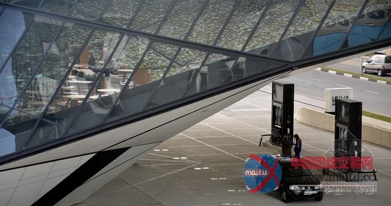 建筑的平面形式类似一个大铲子,沿路的一侧具有很长一段的悬挑空间,那里作为加油站,将更多的地面空间还给了城市,同时为加油的汽车门提供了一个遮阳避雨的大屋顶。(是不是比我们的红色大方顶艺术多了~~)