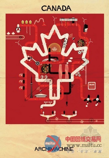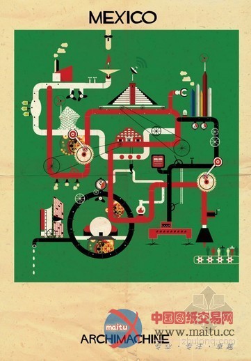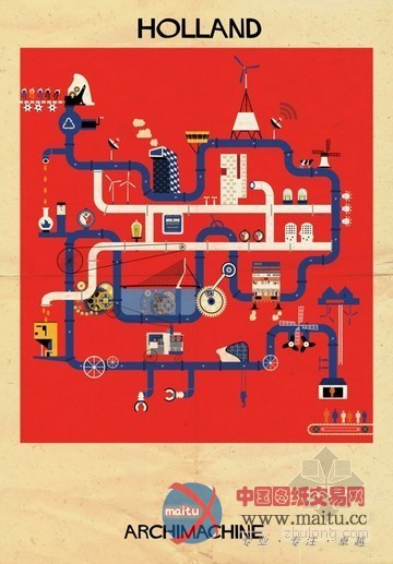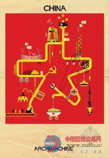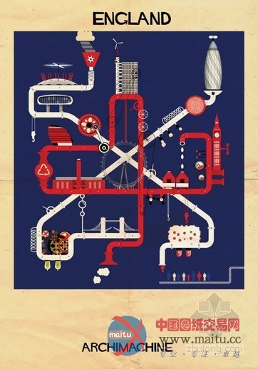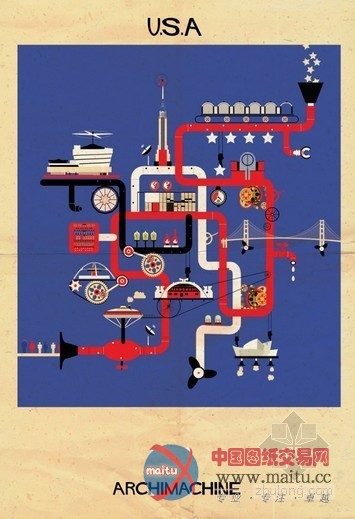 ARCHIMACHINE系列插图共17张,分别代表17个国家,每部机器由各个国家标志性色彩、符号与建筑组成。Babina想借ARCHIMACHINE系列来比喻建筑是如何作为机器的基本配件,在场地和场地里的居民中的个性/文化生产中运作的。