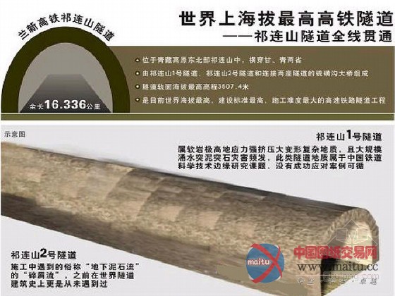 兰新高铁祁连山隧道工程由祁连山1号隧道、祁连山2号隧道和连接两座隧道的硫磺沟大桥组成,全长16.336公里,隧道轨面海拔最高高程为3607.4米,是目前世界海拔最高、建设标准最高、施工难度最大的高速铁路隧道工程,有“世界高铁第一高隧”之称。
