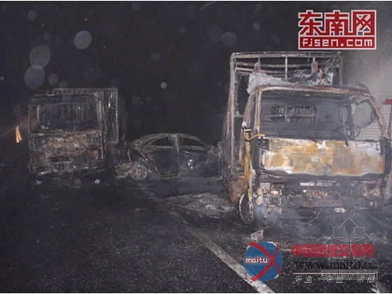 在事发的飞鸾岭隧道,虽然火势已被扑灭,但空气中仍飘散着浓烈的烧焦味。隧道内,一辆货车和一辆小车被烧得只剩下空壳,后面一辆货车驾驶室被烧得面目全非。受大火炙烤,隧道顶部的水泥呈块状脱落。