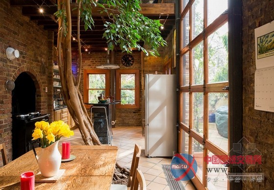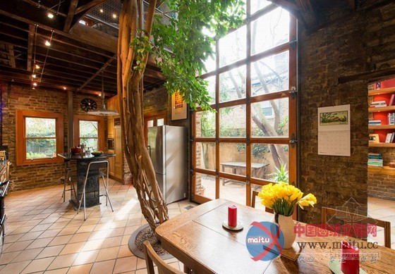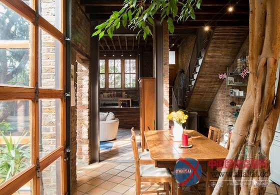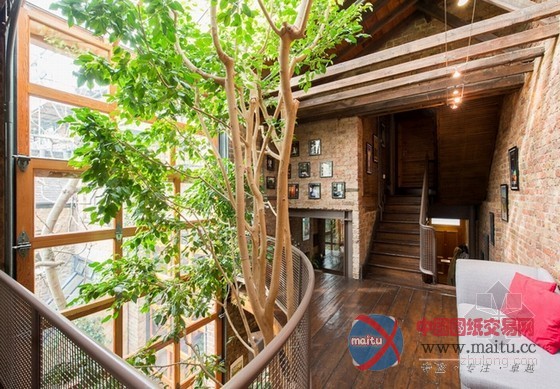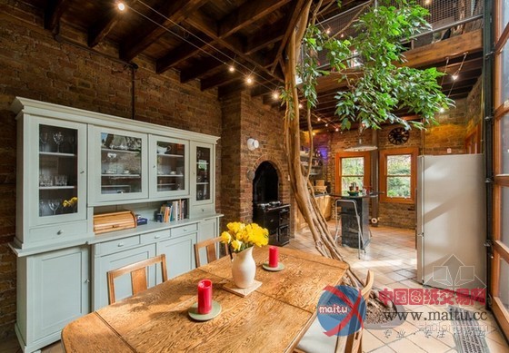 这套阳光Loft公寓室内设计,绝对让你一进门就感受到巨大的惊喜。保留原始的砖墙及梁柱,格外有老旧的年代感,挑高空间搭配大片的落地采光,阳光大剌剌洒在每个角落,明亮的空间看起来更开阔。往餐厅厨房走,一个巨大的惊喜,一棵大树矗立在正中央,延伸至顶,大树没被砍断,反而与住家融为一体,让空间更有生命力,果真是货真价实的自然风住宅。砖墙、阳光、植物,这三者不论怎么搭配就是舒适耐看。
