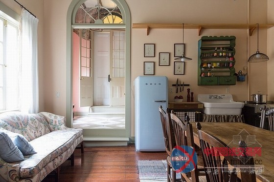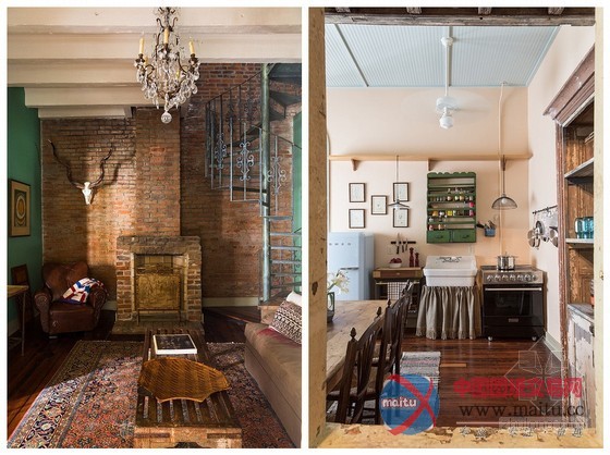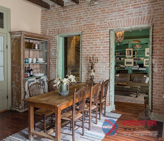 怀旧复古法式风情乡村住宅设计由洛根基伦室内设计完成,坐落在美国新奥尔良的法国区。入口处采用了典型的法式拱形门框,漆成马卡龙色更显清新活泼。法式乡村的重点元素便是呈现木作刷旧、洗白色调的怀旧仿古风情,餐厅区域保留着古老的红砖墙、旧木门框与横梁木作,很简单也很有乡村味。再往里走,水晶灯、铁艺旋转楼梯、老式的不加遮掩的壁炉再加上软装的点缀勾勒出一丝流浪的吉普赛风格。