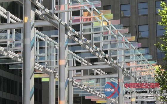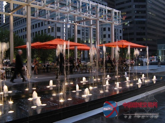 在场地的最边缘,整形的空中绿篱不仅界定了广场空间,还过滤场地和约翰•f•肯尼迪大道繁忙活动的噪音。在广场上,由独特的、明亮的玻璃箱构成柱基作为咖啡馆备餐间的支撑结构。玻璃箱由双色格子玻璃、钢材、葡萄藤组成。动态喷泉提供了基座和主要广场之间一个线性的纱帘。广场铺设条带状花岗岩,以强调塔的网格结构。为了将外部空间从外观到功能上连接到室内空间,道路铺砌延伸到了建筑的冬季花园。