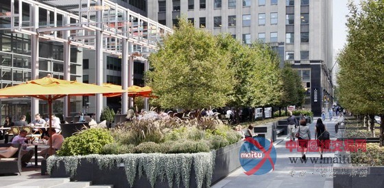 费城康卡斯特中心广场是由OLIN设计的,面积2英亩。这座令人印象深刻、经LEED绿色建筑认证层高为56的办公楼是费城最新、最高的大楼。康卡斯特中心的威严和优雅是在奥林广场的基础上延续的。然而,这个广场不仅仅只是一栋建筑合适的平台,它更是一个充满活力、运转良好、与城市“无缝对接”的公民空间。它作为一个居民和工人新的目的地和区域铁路、市场、美食广场的主要入口。广场被设想为一系列的垂直和水平的空间。