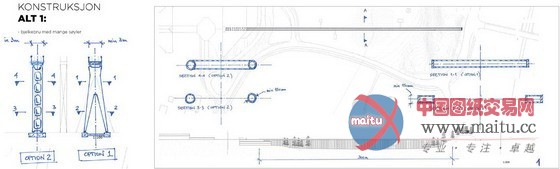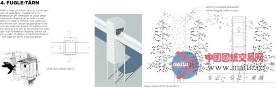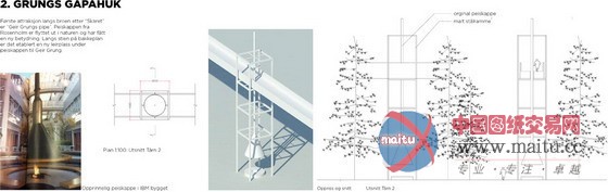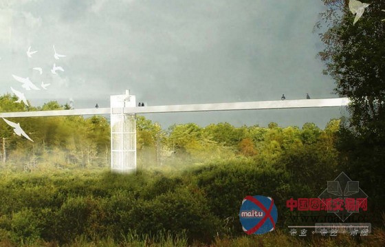 一条330米长的行人天桥,联系Rosenholm校园与Rosenholm车站。完美的直线,劈开岩石,跨越低谷,穿行林冠。四个功能不同的角楼(火炉楼,回收物件装饰的交通楼,鸟巢楼,钟楼)支撑起这条“线”。每个角楼都拥有各自诗意的气质。虽然长度巨大,但是比例协调,表达无懈可击。