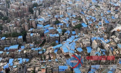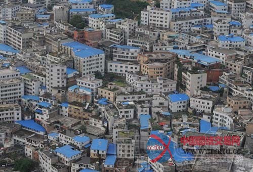 2014年5月14日,贵阳市云岩区东面许多楼房最近都被加了“铁皮帽子”。这些密集的楼房中,大多数是七八层楼,看不出规划与秩序,这些密密麻麻的楼房最高一层用板房的铁皮盖着,从高处望去成了城市上空的棚户区。