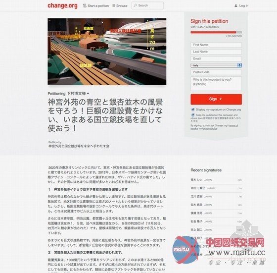 因此,以建筑师伊东丰雄和槙文彦为代表的团体发起了请愿活动,呼吁当地和国家机关捍卫和保护城市的明治神宫球场和附近的花园。请愿活动是为了找到解决方案,更加关注人口规模、社会规矩和公共绿色空间的综合建造。扎哈建造的球场总高度为70米,相当于20层楼那么高,非常壮观。请愿团体呼吁将80,000 个座位减少至50,000个,而且添加临时座位,举办大型活动时能用得上。toyo ito也在寻求更加可行的方案,改善、整修现有的体育场,不影响周围环境和社区。该请愿活动需要1,700 个签名,这样比较正式,更有效果。