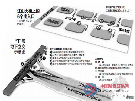 6月这一地下立交正式通车后,人们印象中遥远的青奥板块,立即与主城拉近了距离。立交的三层空间中共贯穿了11条匝道,其中有6条在“T”这一“竖”的主线隧道上,庐山路口一进一出,江东南路口两进两出;另5条匝道在“T”字交会点附近,一是从江山大街主隧道右拐进青奥会议中心;二是从主隧道右拐至扬子江大道;三是青奥会议中心右拐至扬子江大道;四是由扬子江大道隧道北往南方向左拐进江山大街主隧道;五是由扬子江大道隧道南往北方向右拐至主隧道。