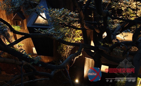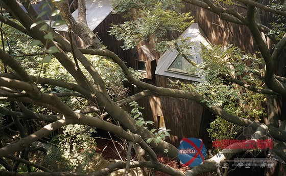为了避开树根,地基只好往后退了。可是楼地板面积总是要尽量争取,所以中村让房子长在树枝跟树枝间的空隙上,于是形成了如图中的这副外观。