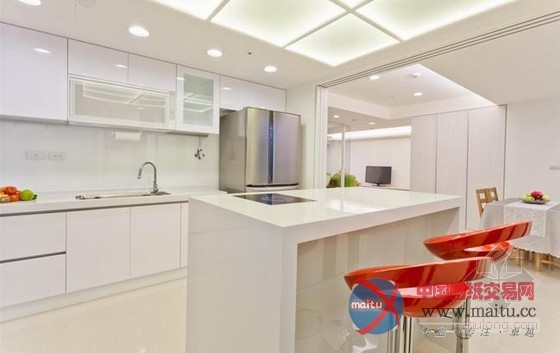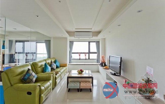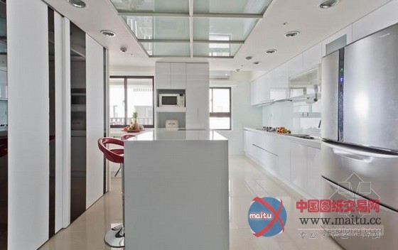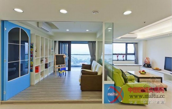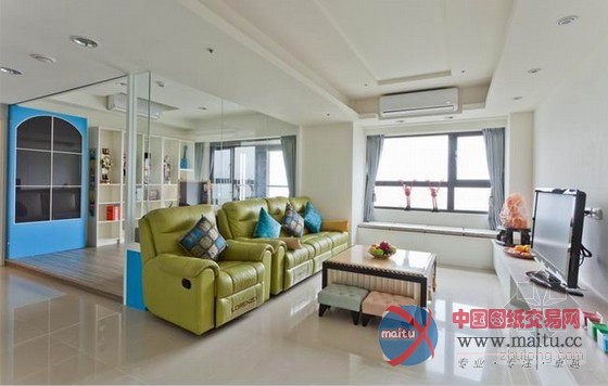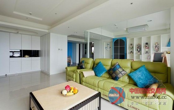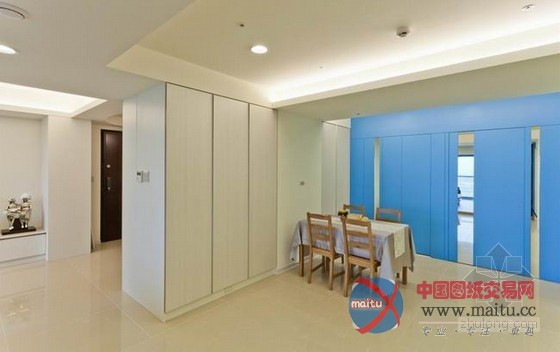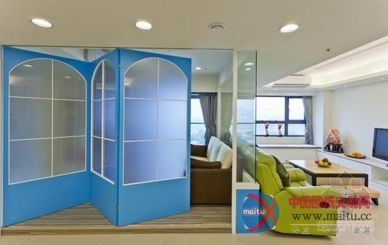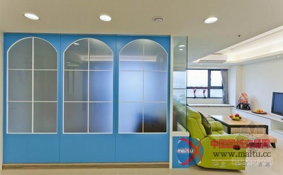 台北简约地中海家居装饰设计,客厅及书房採用折叠门让整体空间放大开放效果,因女屋主喜爱地中海风格,於是搭配地中海圆弧拱门及浅蓝色让整体带进微微得味道。餐厅部分的蓝色墙面搭配明镜让原有狭小的餐厅视觉感官放大,而此餐厅墙面便是客卧及客浴的门片隐藏其身。厨房部分衍生餐厅的效果,厨房採用中岛柜让整体空间的实用上增加。主卧及客卧则跳脱公共空间的效果,让主卧可进入另一个休息元素。