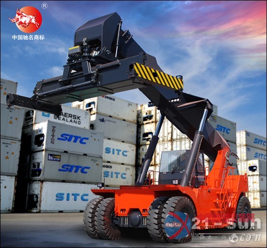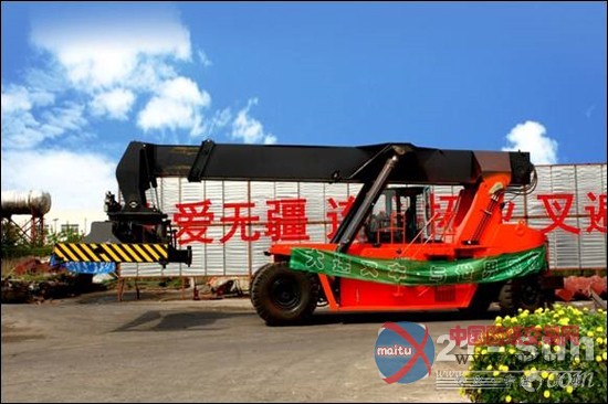 2002年,大连叉车有限责任公司的前身——大连叉车总厂,研发设计出中国第一台45吨正面吊运机,这是一款专门为20英尺和40英尺集国际装箱而设计的,主要用于集装箱的堆叠和码头、堆厂内的水平运输,与叉车相比,它具有机动灵活,操作方便,稳定性好,轮压较底,堆码层数高,堆厂利用率高等优点。可进行跨箱作业。特别使用于中小港口,铁路中转站和公路中转站的集装箱装卸,也可在大型集装箱码头作为辅助设备来使用。整车设计高标准、高性能,达到国内领先水平,国际先进水平。配有司机室移动、CAN总线控制系统、变量液压系统、符合欧Ⅲ排放标准的发动机。45吨正面吊运机由工程机械底盘、伸缩臂架、集装箱吊具等三部分组成,底盘有发动机、动力换档变速箱、前桥、后桥、转向系统、驾驶室、车架、配重、车轮等部件;伸缩臂架有伸缩油缸、俯仰油缸、臂架等部件;集装箱吊具有旋转机构、上架、联接架、底架、伸缩架、伸缩油缸、防摇油缸、侧移油缸、旋锁油缸等部件。45吨正面吊运机有可伸缩和左右旋转的集装箱吊具,能用于20英尺、40英尺集装箱装卸作业,吊装集装箱时正面吊不一定要与集装箱垂直,可以与集装箱成夹角作业。在起吊后,可旋转吊具,以便通过比较狭窄的通道。同时,吊具可以左右侧移各800mm,以便于在吊装时对箱,提高作业效率。对于场地条件较差的货运站,正面吊也能正常作业。伸缩式的臂架,可带载变幅,集装箱的起降由臂架伸缩和变幅来完成,在臂架伸出和俯仰油缸伸出时,其起升速度较快,在下降时同时锁入,可获得较快的下降速度。在作业时,可同时实现整车行走、变幅、臂架伸缩动作,具有较高的工作效率。