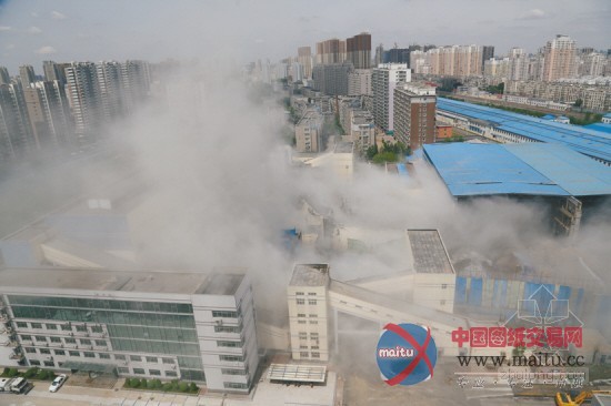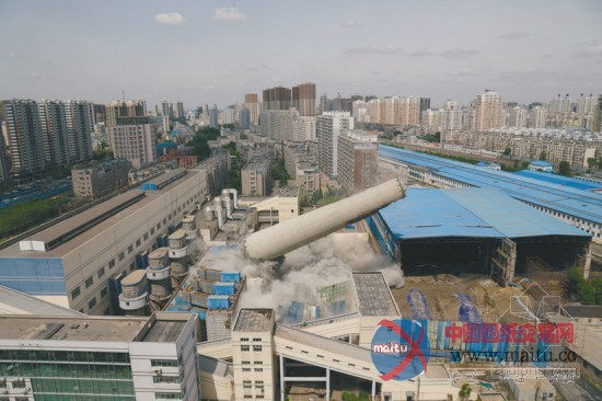 “嗵!”一声巨响,150米大烟囱剩余的下半截迅速倾倒……5秒后,“嗵——”传来触地震荡巨响,下半截烟囱不偏不倚,正倒在事前预留的位置:正北方向狭窄的区域里。同时,灰白色的烟尘漫天飞舞。几分钟后,洒水车驶入爆破后的现场,对着爆破废墟予以喷浇降尘。