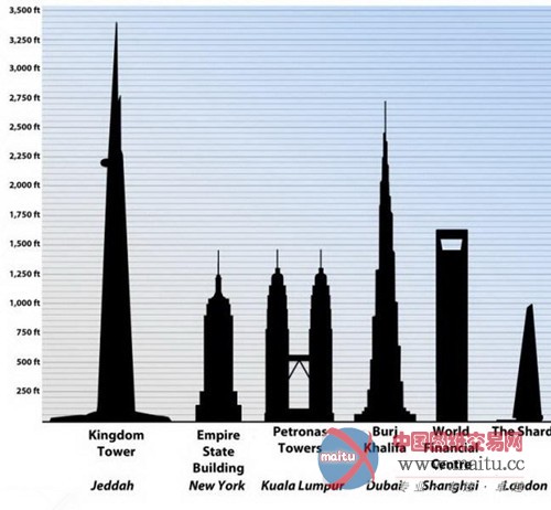 上图中是整体高度1000米的国王塔与美国纽约帝国大厦等建筑的对比图,未来它将是集合酒店、写字楼、住宅公寓为一体的超级摩天大楼。