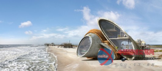 艺术家Dionisio González设计了“多芬岛”系列,很有未来主义风格,采用铁和混凝土建造房子,这位艺术家同时也是建筑师、工程师和城市规划者。这栋海滨房子造型奇特,可作为堡垒,外观上也像是宇宙飞船,是为多芬岛的居民建造的。多芬岛位于阿拉巴马州的海岸边,地处墨西哥湾,这里多发飓风。岛上约有1200人,飓风袭来时,会冲走的海岸线,迫使人们一次又一次地重建家园,这种住房设计能有效应对灾害,降低居民的损失。