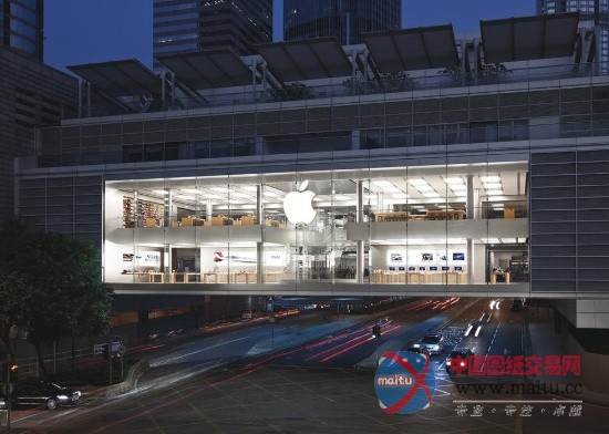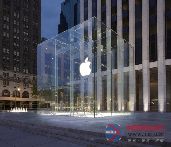 位于纽约第五大道的苹果旗舰店外观是由几块高达32英尺的巨大玻璃组成的,而内部的透明楼梯则通向零售店超大的内部空间。