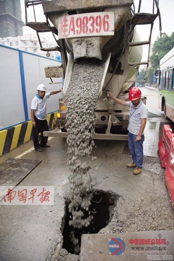 南宁地铁工地附近道路塌陷 施工方喂混凝土补坑