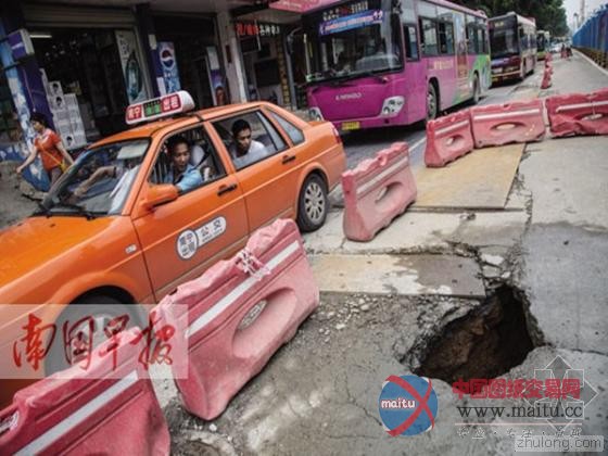 6月11日上午8时,南宁地铁二号线友爱北站附近路面出现塌陷,一辆汽车的轮子陷入坑中。车辆被拖出后,地铁施工人员发现,地下居然有一个约5米深、数十立方米大小的空洞,随即调来混凝土填入。
