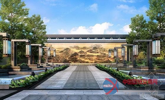 1、在新中式景观设计中采用传统符号用抽象或简化的手法来体现中国传统文化内涵,运用形式多种多样,可镶刻于景墙、大门、廊架、景亭、地面铺装、座凳上;或以雕塑小品的形式出现;或与灯饰相结合。