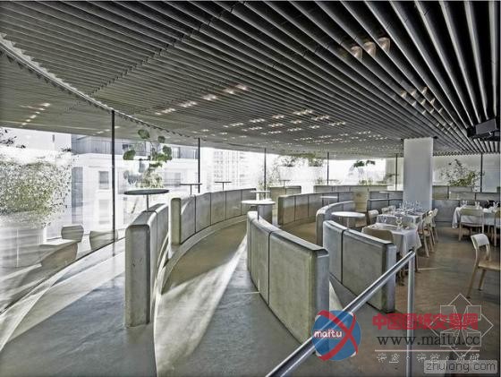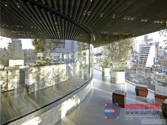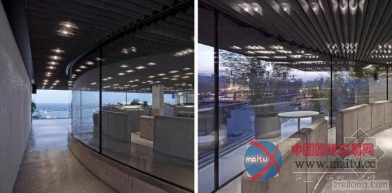 包裹圆形玻璃构体的露台可以从不同的两端俯瞰拥挤的城市,提供了延伸的开阔视野,同时与酒吧内部建立一种模糊的联系,随着光线的差异、日夜的变化,人们可以从不同的角度看到不断变幻的“玻璃馆”。
