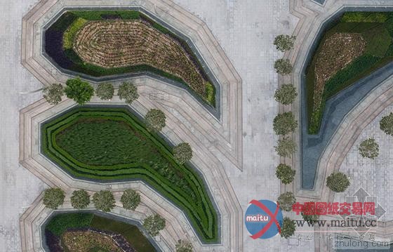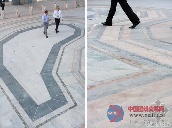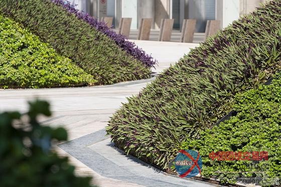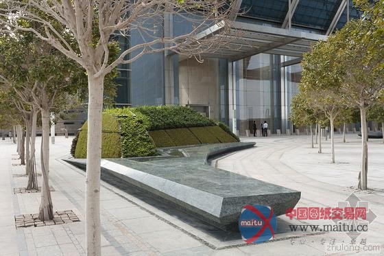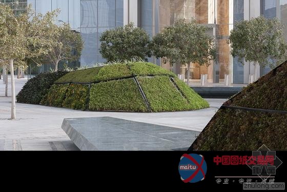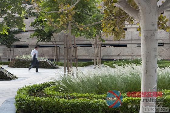 大的绿植堆体构成广场结构。这些堆体看起来像极了室外房间,可以抵挡寒冷的夏马风(来自波斯湾的西北大风),因而降低人行步道的风力;同时又在高耸的钢筋混凝土建筑物中间形成了亲密的空间。聚集的堆体形成的装饰性图案将整个广场编织成了一张大地毯。