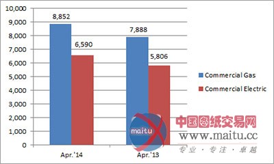 2014年一至四月,商用燃气热水器销售总量为33,557台,比去年同期的32,396台增长了3.6%。商用电热水器的销售总量为24,735台,比去年同期的21,957台增长了12.7%。