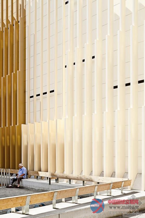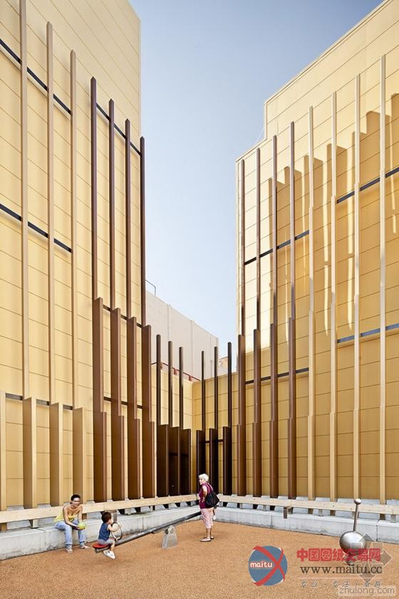 这一新的空间将被整合到现有广场之中,并被人们看作是广场的一部分。为了达到这一目的,建筑正面原有的预制混凝土铺地被移除,原先位于广场中心位置的花岗石板铺地得以延伸。新的娱乐设施根据它们各自的特点和需求进行了安置,一共有两个不同的地区:一个是铺有橡胶地面、包含儿童游乐设施的场地,相对封闭以保护儿童;另外一个则是开放的,像广场的其它部分一样同方向使用了花岗岩铺装,只不过石块更小一些,这部分有供成年人使用的设施。这两个区域由叠层木板制成的大型长凳分隔开来,这些木板由劈开的木兰树树干制成,成为十分鲜明奇特的景观要素。长凳起到了儿童游乐场的屏障作用,并与延伸的镀锌铁管型材相辅相成。