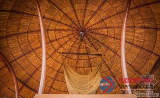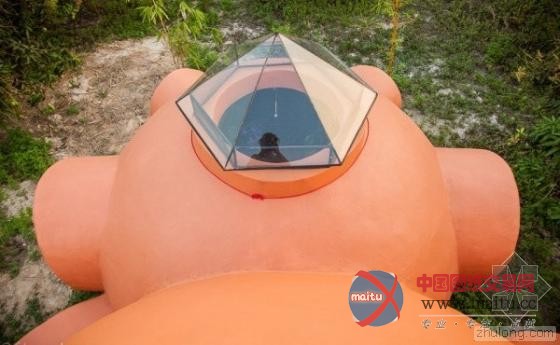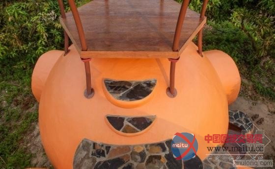 以圆顶为概念设计的房子配上亮眼的橘色,在这绿意盎然的园子里显得十分醒目。屋顶的玻璃通风设计与一般的烟囱不同,三角造型就像是法国罗浮宫的玻璃金字塔的迷你版一样。卧室上方搭建的小亭子使用充满浓浓东南亚风情的茅草作为屋顶,坐在上面让人能远眺整片香蕉园,心情顿时开朗,烦恼通通都抛到九霄云外去了。