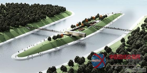 此方案用一条主要的的纵向游览流线,和两条横向流线,将石景观岛划分为滨水平台、前海石广场、四季林地、室外剧院、观景甲板、天然茶室、秘密花园几个景观节点。结构高效轻盈的步行桥,将小岛和两岸联通,也成为整个景观规划的一个重要部分。为最小化对场地自然片段的缺失,景观的大部分构筑物均被抬高,以减少对植被的破坏。用最少的材料提供最丰富的空间。