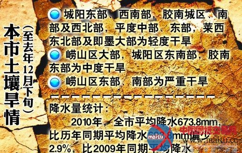 4日市水文局宣布了2010年降水、蓄水、旱情的团体环境。“10月份以来,全市降水量非常偏少,呈现了汗青罕见的旱情。”事情人员奉告记者。2010年10月1日至12月31日,全市平均降水仅 9.1mm ,比积年同期偏少86.9% ,黄岛、城阳、即墨、胶州、胶南都偏少90%以上,是有水文材料记录以来第2少的年份,仅高于 1969年的5.7mm 。到目前为止,全市平均已有89天无有用降雨,黄岛、城阳、即墨、胶州、胶南连续无有用降雨天数已超越100天。