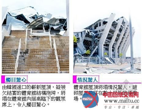 整座体育馆的修建物超越一半已成废墟,犹如片子灾害片中的不测现场,灰尘飞扬,所幸并未有性命伤亡的消息传出。