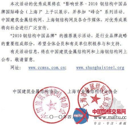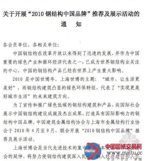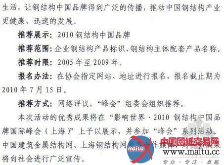关于开展“2010钢结构中国品牌”推荐及展示活动的通知