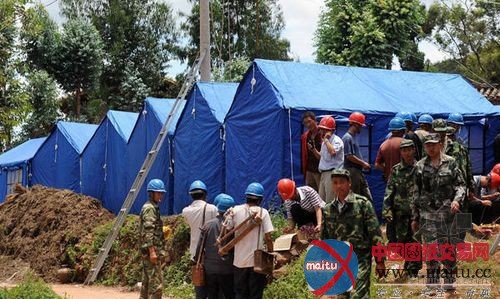 7月10日,云南省楚雄彝族自治州姚安县官屯乡官屯村刚搭建起来的帐篷。