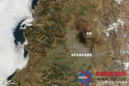 地动产生后,NASA图片表现,智利都城上空呈现黑烟
