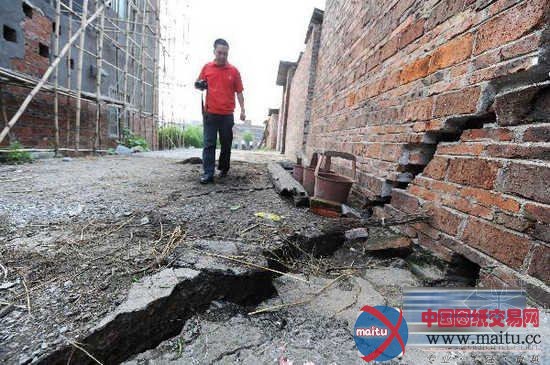 地陷造成村庄里的地面和房屋墙体开裂(6月3日摄)。