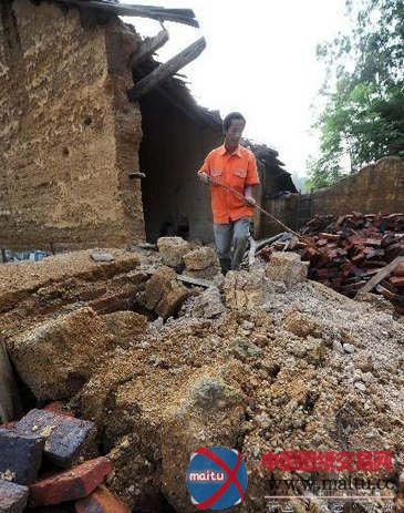 村夷易近何发忠家的土墙房一面墙已倾圮(6月3日摄)。