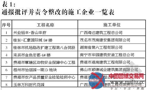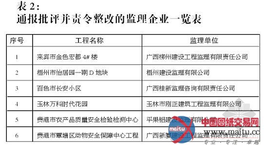 按国度和自治区修建工程安然出产管理的有关划定,广西住建厅下发通报,对项目管理人员不到位、施工现场存在严峻质量安然隐患,未能定时完成整改和至今未对督查组定见有书面反馈所触及的8家施工企业(表1),对现场监理履职不到位、未能定时完成整改,且施工现场存在质量安然隐患和至今未对督查组定见有书面反馈所触及的6家监理企业(见表2),予以全区通报批评并责令整改。在整改合格前,企业和相干管理人员在广西境内不得插手工程投标、不得承接新工程项目。对存在质量安然隐患的18个工程项目,所触及的17家施工企业和12家监理企业,予以全区通报批评。