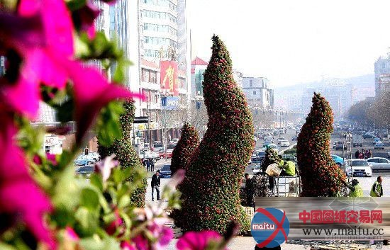 为欢迎“五一”黄金周八方旅客,连日来,市区园林部门用50万盆各种鲜花装潢各公园和广场,使美丽的滨城更加亮丽多彩。图为4月24日园林工人正在人夷易近广场搭建火焰造型的花草景不雅。
