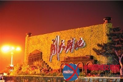 都城博物馆门前“喜迎华诞”花坛,以花鼓造型为前景,犬牙交错,别开生面。